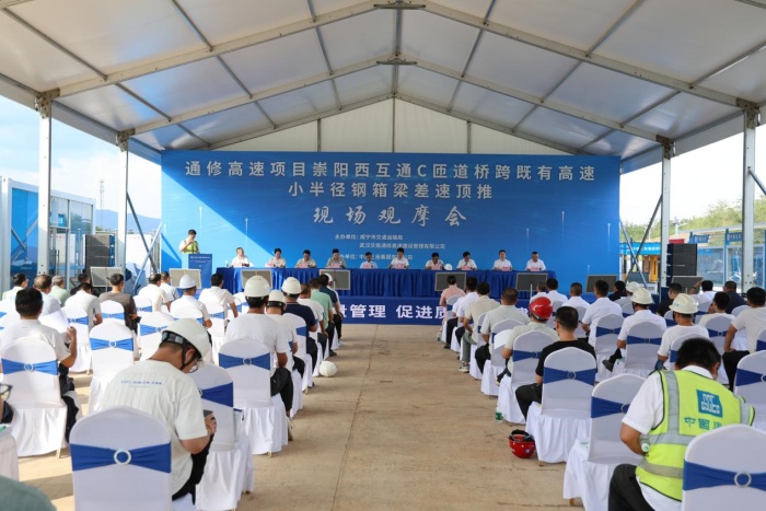9月4日,通城至修水高速公路(湖北段)崇陽西互通C匝道橋跨既有高速小半徑鋼箱梁差速頂推觀摩會成功舉行。來自湖北省交通運(yùn)輸廳工程事務(wù)中心、咸寧市交通運(yùn)輸局、武漢城發(fā)集團(tuán)、武漢交投集團(tuán)及相關(guān)建設(shè)、設(shè)計(jì)、監(jiān)理、施工單位等共百余人參加了此次觀摩交流活動(dòng),共同聚焦橋梁建設(shè)關(guān)鍵技術(shù),探索交通工程創(chuàng)新發(fā)展路徑。