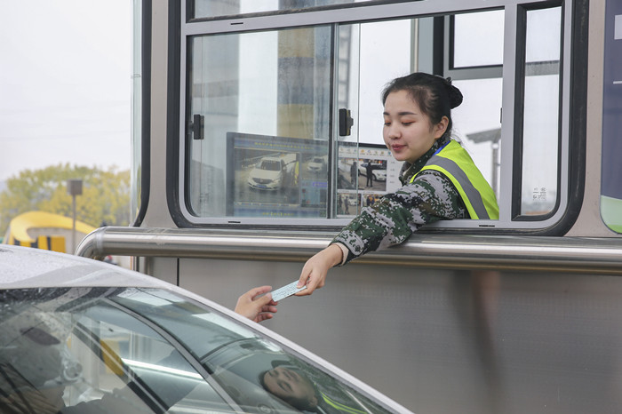 12月26日12點(diǎn),收費(fèi)員為駛?cè)胛渖罡咚俸倍谓鸶凼召M(fèi)站的第一臺車輛發(fā)放通行卡