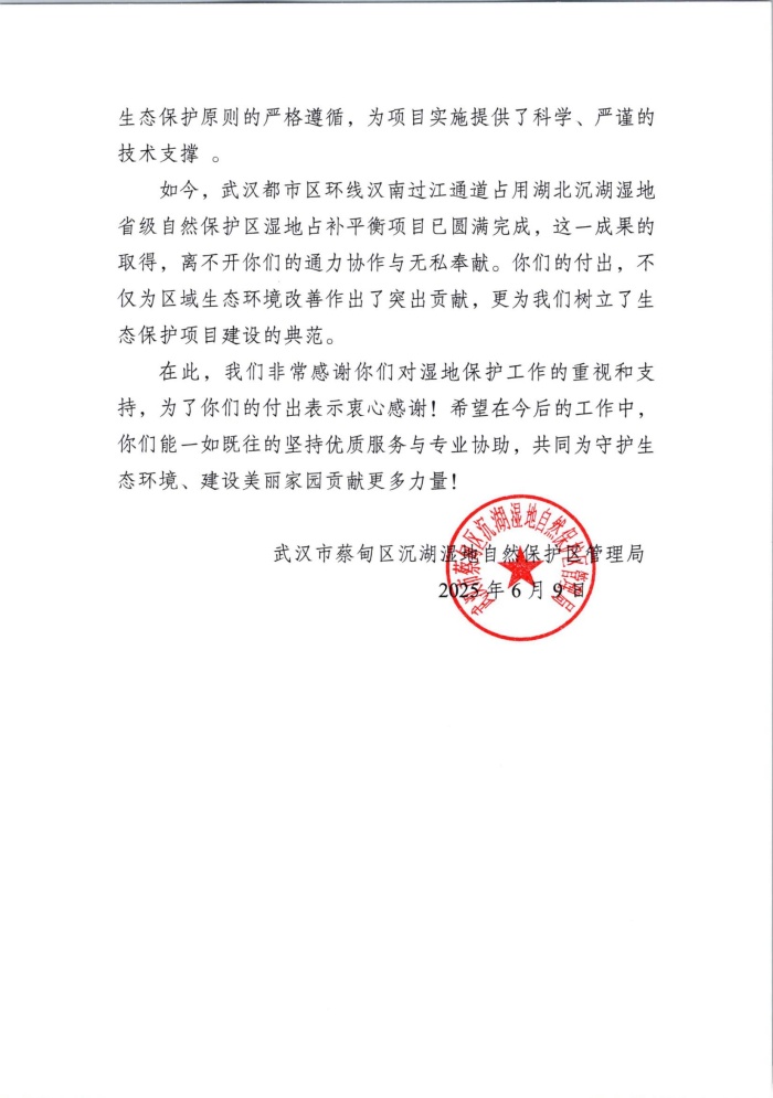 初夏六月,荷尖初露,武漢都市圈環(huán)線高速公路漢南長(zhǎng)江大橋及接線工程沉湖濕地保護(hù)區(qū)內(nèi)蛙鳴漸起、蒲草搖曳,處處涌動(dòng)著蓬勃生長(zhǎng)的活力。在這萬(wàn)物競(jìng)發(fā)的美好時(shí)節(jié),項(xiàng)目團(tuán)隊(duì)收到了來(lái)自蔡甸區(qū)沉湖濕地自然保護(hù)區(qū)管理局的感謝信。信中特別指出,項(xiàng)目團(tuán)隊(duì)以科學(xué)的生態(tài)修復(fù)方案和高效的執(zhí)行能力,在重大交通基礎(chǔ)設(shè)施建設(shè)與濕地生態(tài)保護(hù)間找到了平衡點(diǎn),繪就了建設(shè)發(fā)展與生態(tài)保護(hù)同頻共振的和諧圖景,為同類項(xiàng)目樹(shù)立了標(biāo)桿。這也標(biāo)志著該項(xiàng)目濕地“占補(bǔ)平衡”工作圓滿收官,在兼顧生態(tài)效益與工程可行性具體實(shí)踐路徑上又探索出了新路徑。
